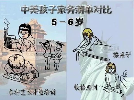 哈佛大学学者曾经做过一项调查研究,得出一个惊人的结论:爱干家务的孩子和不爱干家务的孩子,成年之后的就业率为15∶1,犯罪率是1∶10。爱干家务的孩子,离婚率低,心理疾病患病率也低。 另有专家指出,在孩子的成长过程中,家务劳动与孩子的动作技能、认知能力的发展以及责任感的培养有着密不可分的关系。 在美国,孩子不论年龄大小,都是重要的家庭成员,所以告诉孩子他们在家庭中应该负起的责任是很重要的,而承担家务则是最好的方式。 不同年龄的孩子可以做哪些家务劳动? 下面这是美国孩子的家务清单或许可以借鉴一下: 9-24个月:可以给孩子一些简单易行的指示,比如让宝宝自己把脏的尿布扔到垃圾箱里。 2-3岁:可以在家长的指示下把垃圾扔进垃圾箱,或当家长请求帮助时帮忙拿取东西;帮妈妈把衣服挂上衣架;使用马桶;刷牙;浇花(父母给孩子适量的水);晚上睡前整理自己的玩具。 3-4岁:更好地使用马桶;洗手;更仔细地刷牙;认真地浇花;收拾自己的玩具;喂宠物;到大门口取回地上的报纸;睡前帮妈妈铺床,如拿枕头、被子等;饭后自己把盘碗放到厨房水池里;帮助妈妈把叠好的干净衣服放回衣柜;把自己的脏衣服放到装脏衣服的篮子里。 4-5岁:不仅要熟练掌握前几个阶段要求的家务,并能独立到信箱里取回信件;自己铺床;准备餐桌(从帮家长拿刀叉开始,慢慢让孩子帮忙摆盘子);饭后把脏的餐具放回厨房;把洗好烘干的衣服叠好放回衣柜(教给孩子如何正确叠不同的衣服);自己准备第二天要穿的衣服。 5-6岁:不仅要熟练掌握前几个阶段要求的家务,并能帮忙擦桌子;铺床/换床单(从帮妈妈把脏床单拿走,并拿来干净的床单开始);自己准备第二天去幼儿园要用的书包和要穿的鞋(以及各种第二天上学用的东西);收拾房间(会把乱放的东西捡起来并放回原处)。 6-7岁:不仅要熟练掌握前几个阶段要求的家务,并能在父母的帮助下洗碗盘,能独立打扫自己的房间。 7-12岁:不仅要熟练掌握前几个阶段要求的家务,并能做简单的饭;帮忙洗车;吸地擦地;清理洗手间、厕所;扫树叶,扫雪;会用洗衣机和烘干机;把垃圾箱搬到门口街上(有垃圾车来收)。 13岁以上:不仅要熟练掌握前几个阶段要求的家务,并能换灯泡;换吸尘器里的垃圾袋;擦玻璃(里外两面);清理冰箱;清理炉台和烤箱;做饭;列出要买的东西的清单;洗衣服(全过程,包括洗衣、烘干衣物、叠衣以及放回衣柜);修理草坪。 凡是从小就好吃懒做、不爱劳动的人,长大了多不能吃苦,独立自谋能力差,工作成就平平。因此,望子成龙的父母从孩提起就应为孩子创造一种环境和条件,对孩子进行早期劳动训练,让孩子做力所能及 的事情,让孩子生成一双勤劳手,使其终身受益。 孩子在体验中长大,体验越多,感受越深。凡是孩子能做到的事情,家长尽量不要替他去做。孩子进一步大人退一步,这就叫成长。 美国专家谈孩子学做家务 你的孩子是否已经到了可以帮你干一些简单的家务事的年龄,应该如何帮助孩子养成帮助做家务的良好习惯,来自美国的早期教育专家为您提供以下建议: 如果你曾经有过要求你的孩子收拾桌子或是他的玩具的经历,你就会知道这绝对是一场艰难的战争,一个处于学龄前阶段(3-6岁)儿童的孩子已经开始能够对大人的要求表现出不耐烦和抵制的情绪。这可能会使你感到与其要求他去做还不如自己做来得容易。 对父母来说,刚开始时与其说是让孩子帮忙,还不如说是给父母增加负担。但这却是培养孩子养成帮助人的良好习惯的大好时机。四五岁的孩子已经具备了用以完成简单的家务劳动所要求的良好的协调能力、灵敏度和集中力。即使他们不能完全理解父母的意图,对孩子来说也家务劳动是益处多多。父母要充分信任孩子,让他们发挥自信去独立完成某件工作。同时也要帮助孩子理解帮助他人是每个人应尽的责任和义务。 1、让孩子感到自己的重要性 迎合这阶段孩子渴望被看作大人的需求,告诉他,他的工作对家庭带来很大的帮助,会因此节省出更多的时间,让全家人一起娱乐。 2、给孩子提供选择的权利 给你的孩子提供一份所有他能够做的家务的清单,让他/她自己选择其中的一两项工作,这会让他/她感到,自己拥有选择和控制的权力。从而心甘情愿去做自己选择的工作。 3、把任务细致化,并给孩子做示范 一个整体的概念(像“把你的房间收拾好”)可能会让孩子困惑并挫败孩子的积极性。把一个任务分拆成数个步骤(把玩具装进玩具箱里,把书放到书架上摆整齐等等),这样他才会确切的理解你的要求。另外,父母应该亲自给孩子做示范,回答他所有的疑问直到他能够独立完成。父母的耐心是非常至关重要的,即使他忘记了某个步骤,不要批评他,高高兴兴地提醒他知道他记住为止。 4、忘记“完美主义” 对这个年龄孩子来说,积极地参与比起结果来说更为重要。如果你的孩子洗的袜子不够干净,擦的桌子不够亮,不要去批评他的工作,批评会挫败孩子的自尊,更会降低他与人合作的意愿。如果某项工作要求每次都必须完成得尽善尽美,那这绝对不是一项适合孩子去做的工作。 5、给孩子提供合适的工具 不要给孩子一把比他还高的扫帚,给他一个小小的扫帚用来把案板上的面包屑清扫干净。如果你想让她帮你收拾饭桌,那末,就只让她把吃剩的饭菜帮你拿进厨房就行了。 6、给孩子做个好榜样 父母千万不要当着孩