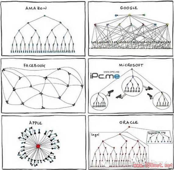 在他笔下,亚马逊等级森严且有序;谷歌结构清晰,产品和部门之间却相互交错且混乱;Facebook架构分散,就像一张散开的网络;微软内部各自占山为王,军阀作风深入骨髓;苹果一个人说了算,而那个人路人皆知;庞大的甲骨文,臃肿的法务部显然要比工程部门更加重要。